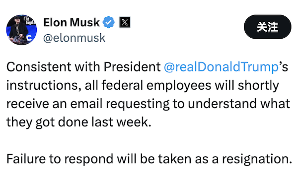美国政府效率部负责人马斯克当日早些时候在社交媒体上表示,按照美国总统特朗普的指示,所有联邦政府雇员12月22日将收到一份电子邮件,邮件会要求联邦政府雇员列举他们在过去一周完成的五项工作内容,未能在24日23时59分前回复这封邮件的员工将被视为辞职。